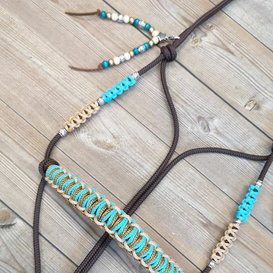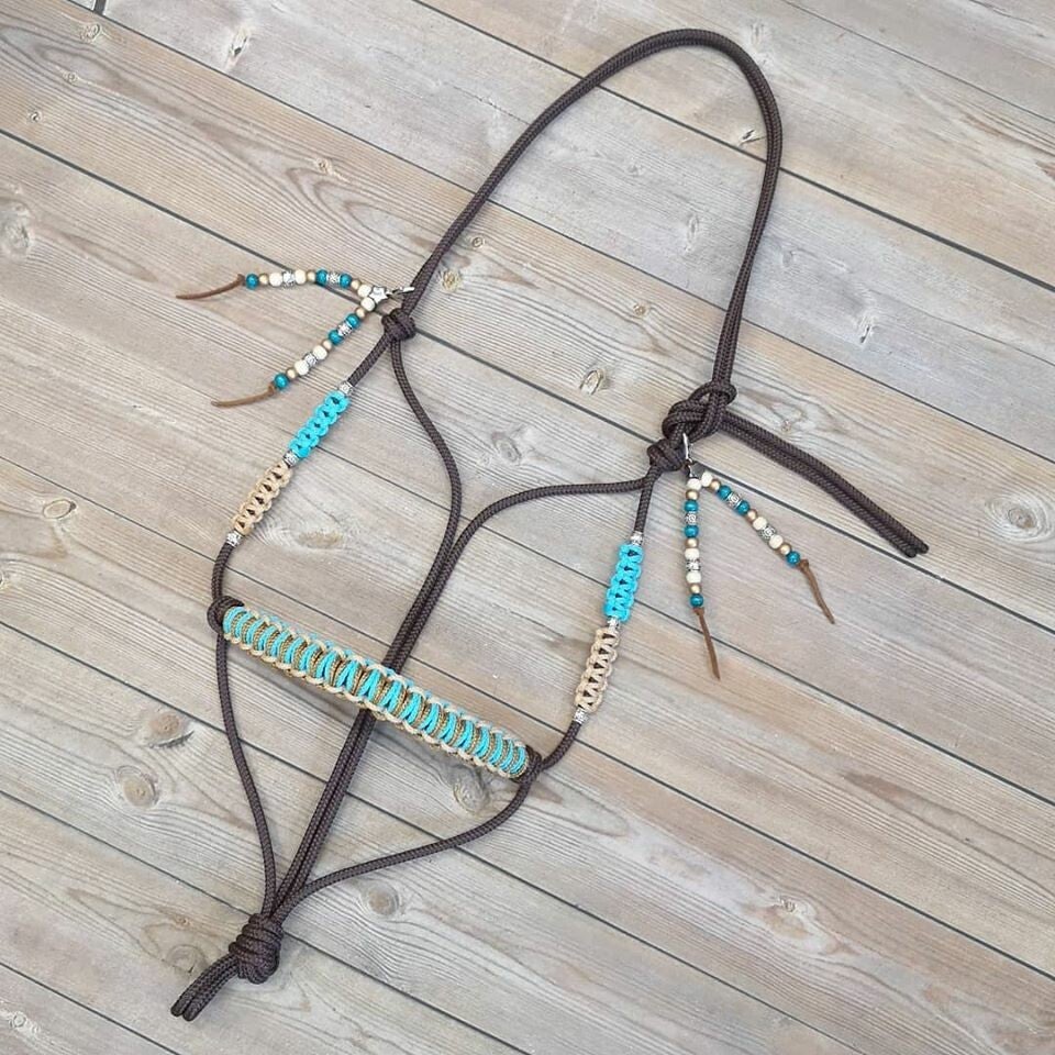 Gaaf touwhalster met bijzonder zigzag neusstuk in max. drie kleuren en standaard twee clips! Op de bakstukken is een bijzonder patroon van kralen en zigzag patroontjes gemaakt. De kralen zijn afgerond, zodat ze niet irriteren aan het paardenhoofd.