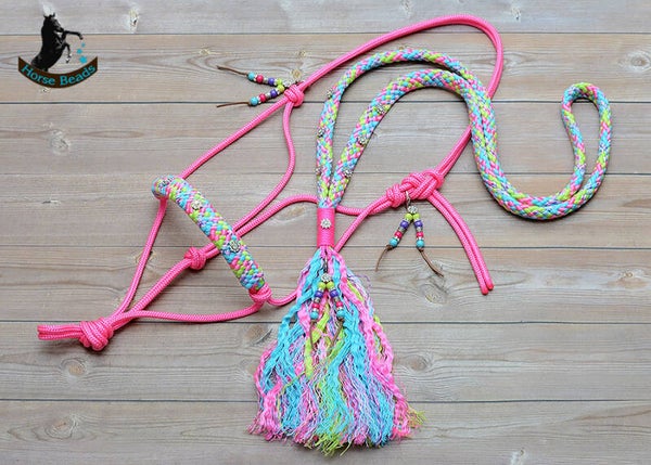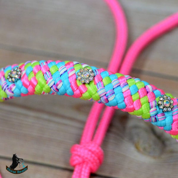 Exclusief halster te kiezen in roze, turquoise of gifgroen als basis. Neus -en/of kopstuk is standaard in hawaiimix.Op het neusstuk zitten AB crystal strass bloemen om het geheel nog opvallender te maken!
