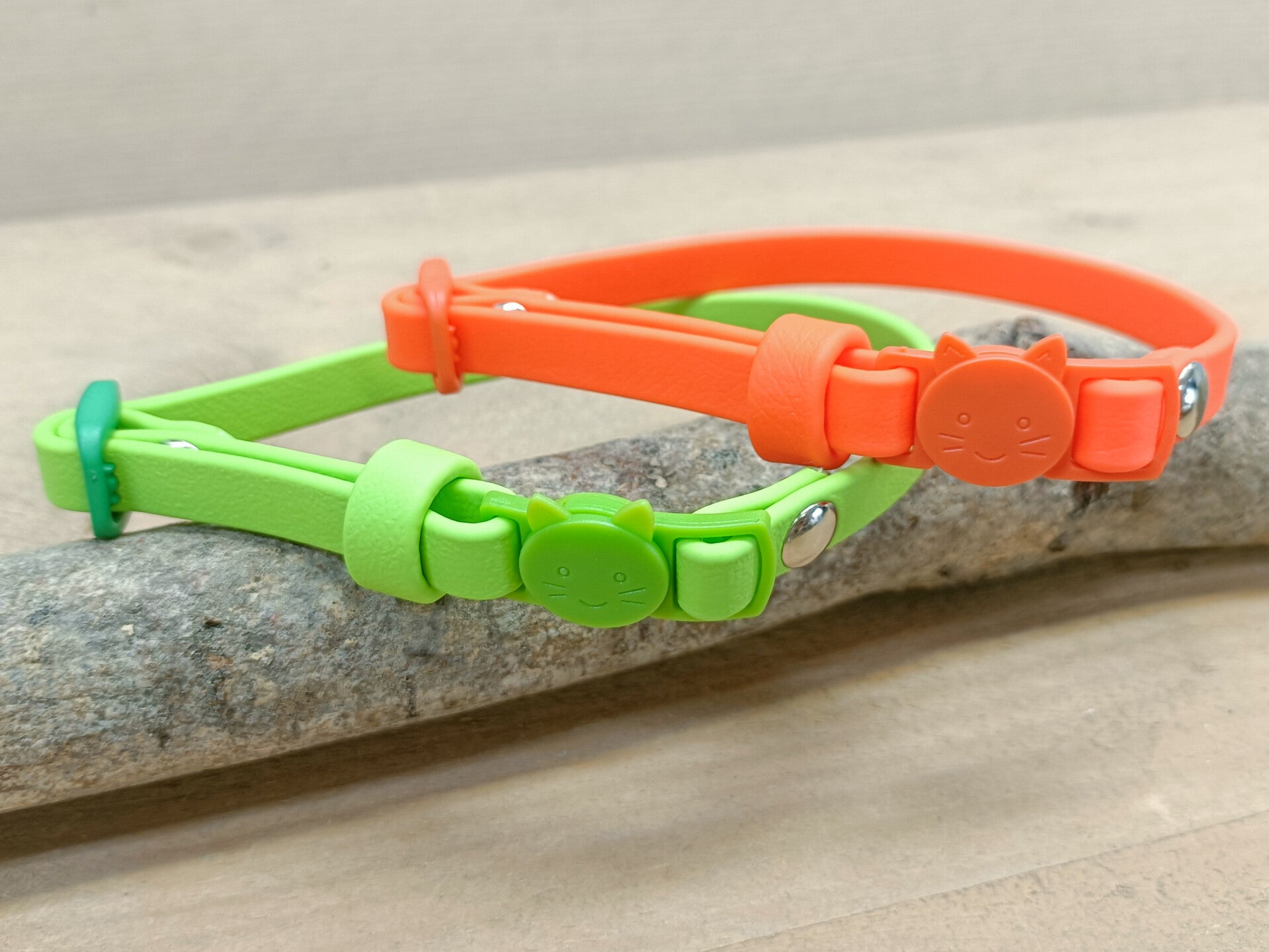 Gemaakt van 9mm breed Biothane met een veiligheidssluiting. Deze schiet los, mocht kat ergens achter blijven haken.