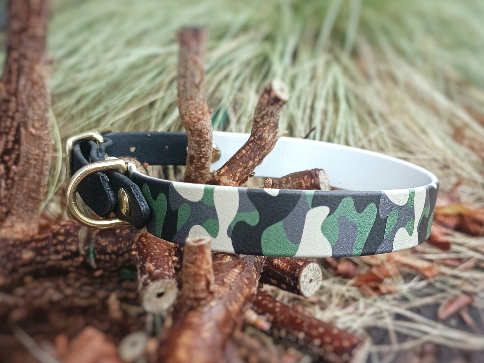 Gemaakt van 19mm., of 25mm. Biothane. Deze halsband is verstelbaar middens een stevige gesp in zilver of goud welke bevestigd wordt aan een slag smaller Biothane in kleur naar keuze.
