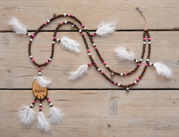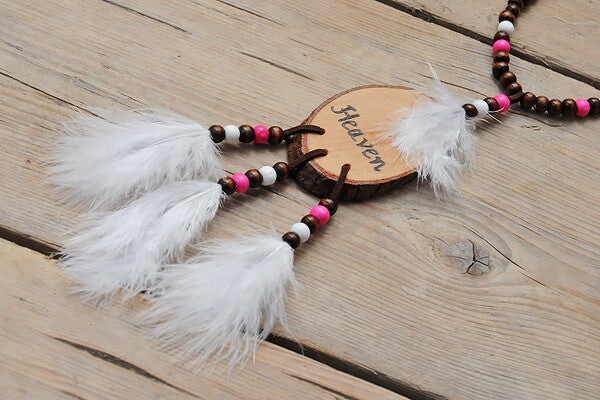 - Houten hanger met naam er in gebrand, verfraaid met bijpassende vogelveren.