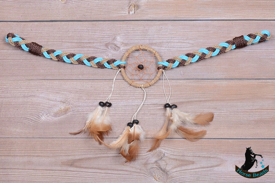 Unieke frontriem gemaakt met vlecht van 3 kleuren touw. Kleuren mogen herhaald worden.Tevens keuze it diverse kleuren dromenvangers, het assortiment hiervan kan varieren.