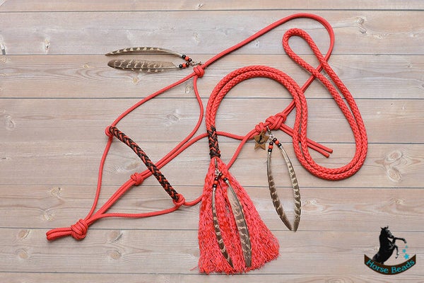 Prachtig uitgevoerde set bestaande uit touwhalster met neusstuk met bijzondere vlecht in max. drie kleuren twee 'Real Feather' clips, neckrope met dezelfde afwerking en een 'Real Feather' clip! Allemaal met mooie getekende vogelveren en kralen in kleuren naar wens! De kleuren die voor het neusstuk gekozen worden, worden ook gebruik voor de afwerking van de neckrope.