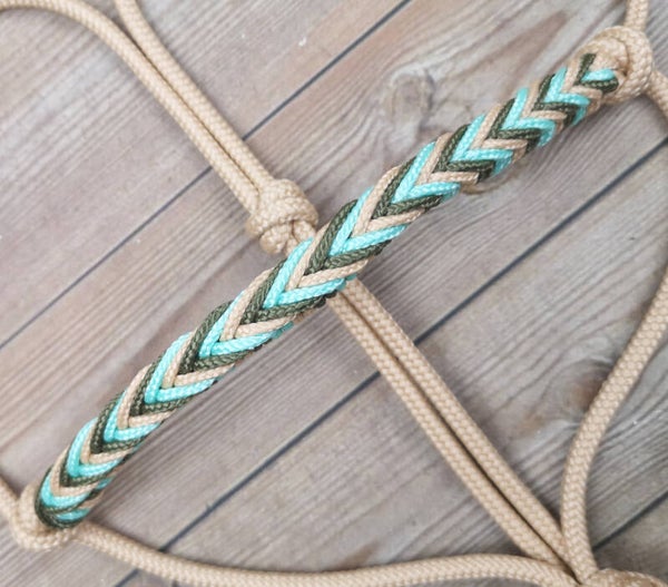 Prachtig touwhalster met neusstuk met bijzondere vlecht in max. drie kleuren en standaard  twee 'Real Feather' clips! Allemaal met mooie getekende vogelveren en kralen in kleuren naar wens!